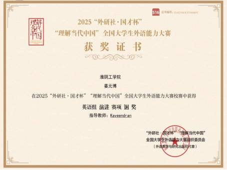 近日,2025“外研社·国才杯”“理解当代中国”全国大学生外语能力大赛校赛结果揭晓,我院姜元博同学在英语组演讲赛项中凭借出色的表现,斩获铜奖,指导教师为Kaveendran。