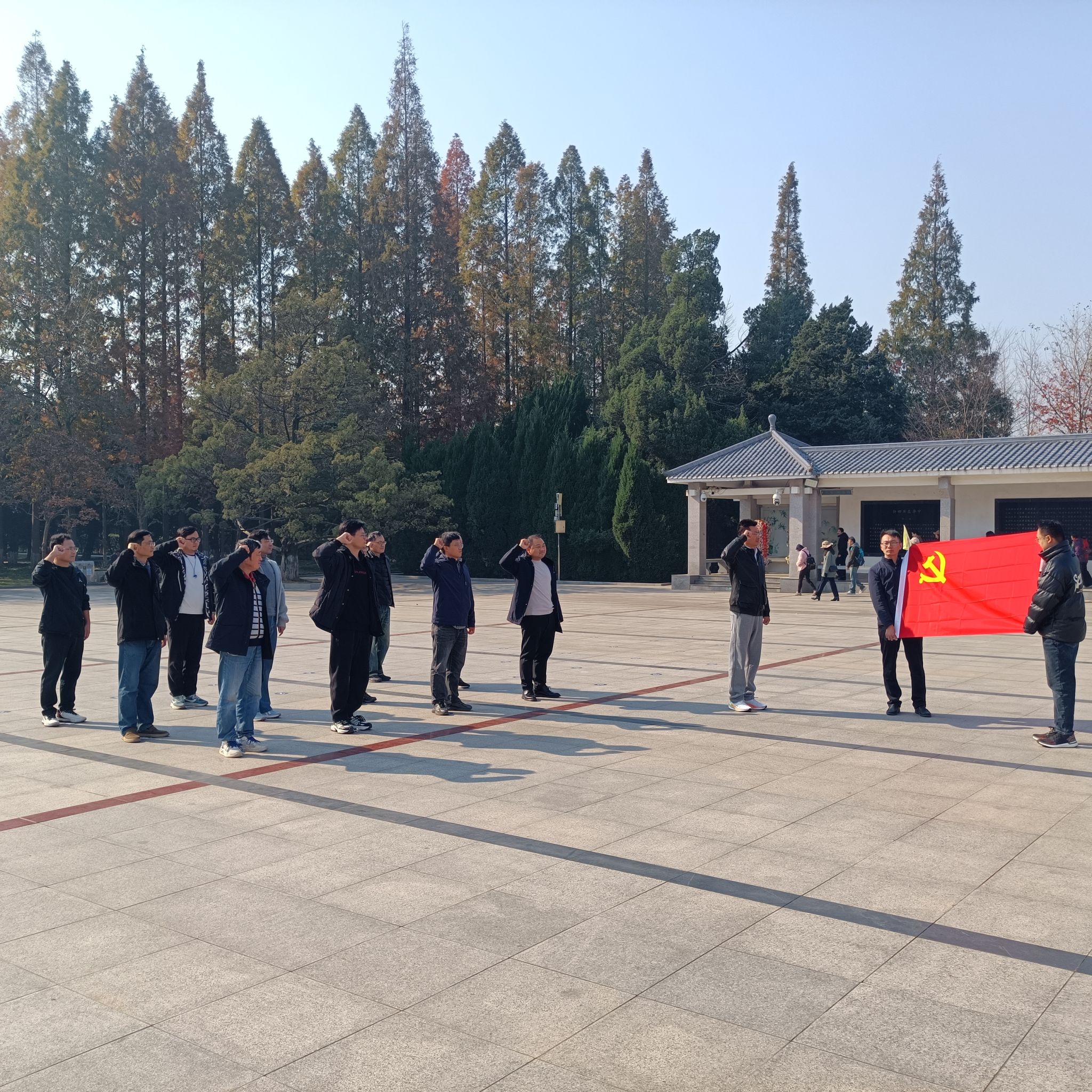 全体党员通过实地祭扫革命先烈、考察地方特色企业,在红色教育中淬炼党性初心,在产业实践中探寻赋能路径,以实际行动践行高校党建服务地方高质量发展的使命担当。怀着对革命先烈的无限崇敬,党员队伍首先抵达新四军刘老庄连纪念园。在庄严肃穆的八十二烈士纪念碑前,全体党员整齐列队,向为民族解放事业英勇献身的革命先烈鞠躬致哀,深切缅怀先烈们的丰功伟绩。面对鲜红的党旗,大家高举右拳庄严宣誓,重温入党誓词,铿锵有力的誓言回荡在纪念园内,进一步坚定了“不忘初心、牢记使命”的理想信念,强化了听党话、跟党走的政治自觉。随后,在讲解员的引导下,党员们依次参观烈士纪念馆、瞻仰砥柱雕像、十二廊柱及八十二烈士墓等场所,通过珍贵的历史图片、详实的文献资料和生动的英雄事迹,深刻感悟中国人民在抗日战争壮阔进程中孕育的伟大抗战精神,接受了一次深刻的党性淬炼和精神洗礼。